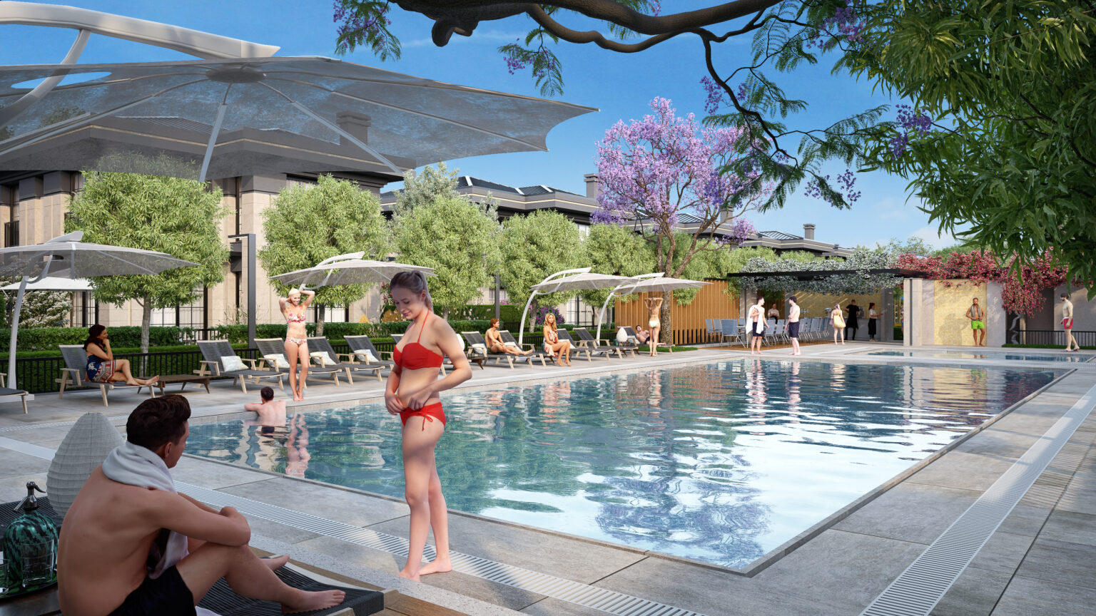 Yetişkinler için 8×18 m, çocuklar için 4×6 m ebatlarında havuzların yanı sıra güneşlenme terasları, duş alanları ve soyunma kabinleri ile donatılmıştır. Havuz çevresinde yer alan oturma alanları, çocuk oyun alanları ve aileler için sosyal alanlar, keyifli bir vakit geçirme ortamı sunar.